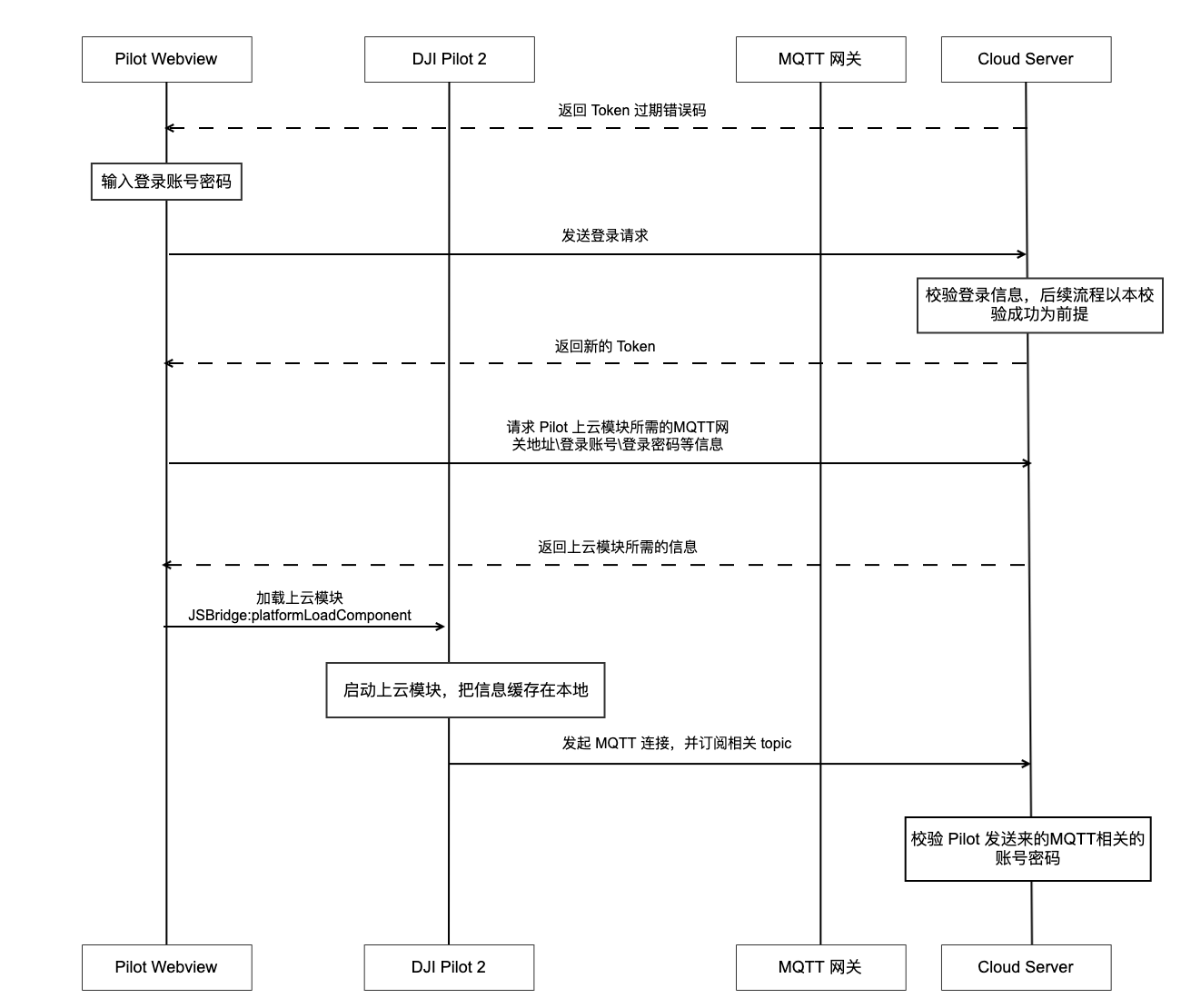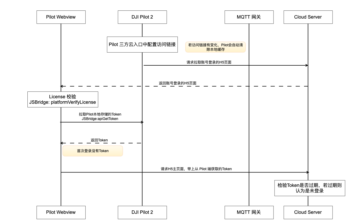 DJI Pilot 2默认是没有加载上云模块的,需要Webview向服务端申请拿到上云模块所需的MQTT相关登录信息,并通过JSBridge加载Pilot2的上云模块和赋值参数。Pilot2的上云模块组件加载之后,会根据获取的MQTT参数,向服务端发起MQTT连接请求,待请求登录成功后,DJI Pilot 2也会通过JSBridge把状态通过回调告知Webview。接口详见 JSBridge window.djiBridge.platformVerifyLicense(String appId,String appKey,String license)