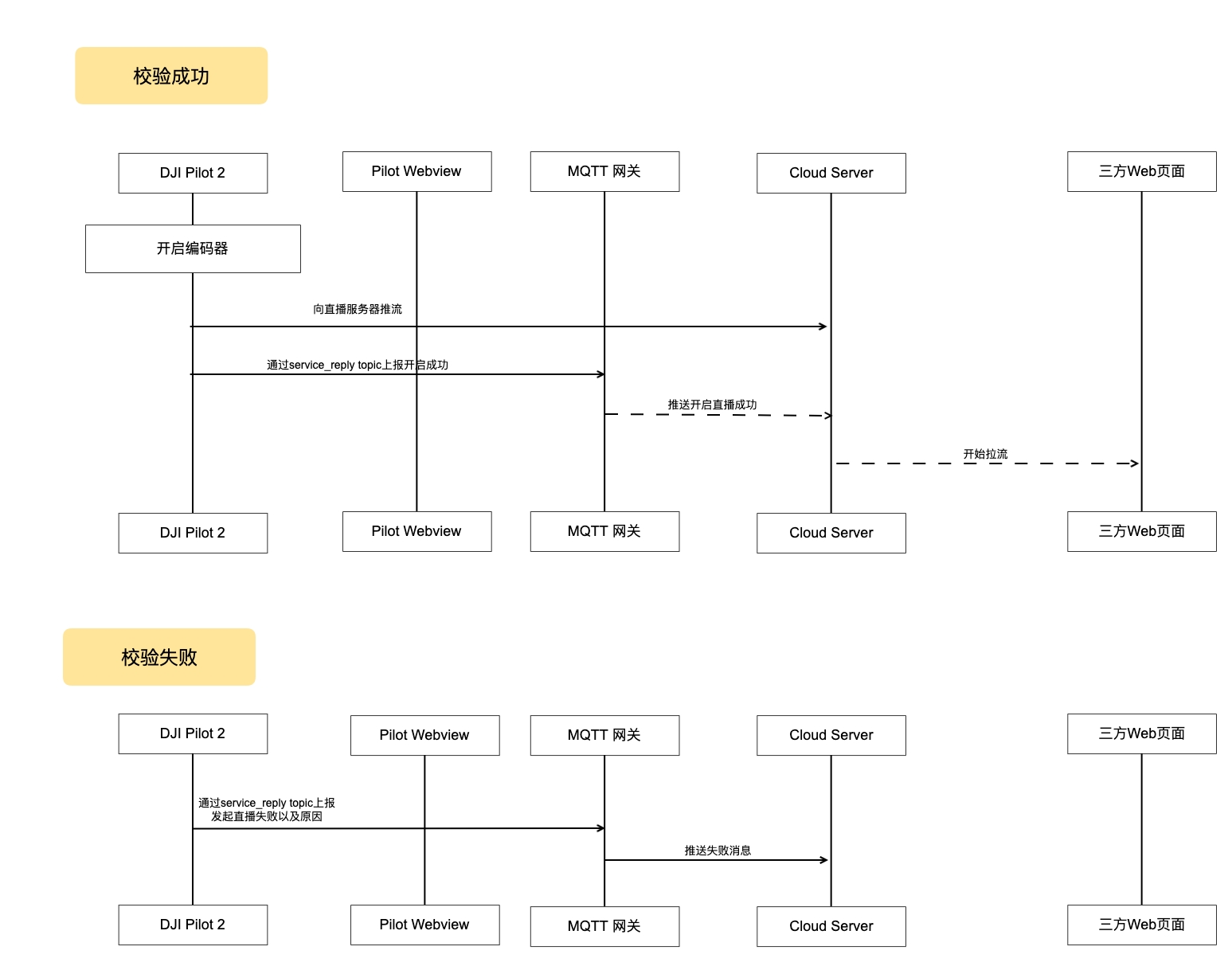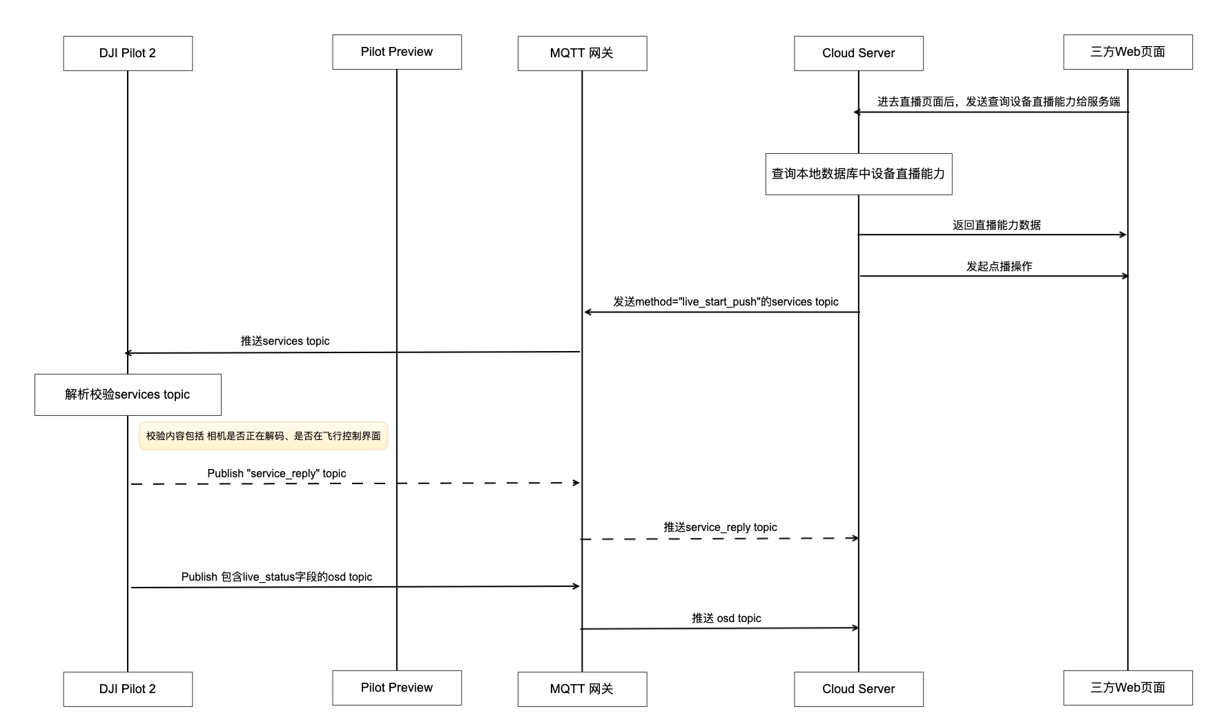 第三方云平台需要预先部署MQTT网关以及流媒体服务器,DJI推流协议支持 Agora/RTMP/RTSP/GB28181 4种模式,其中MQTT网关主要用来做消息通信,配置信息设置和读取。
