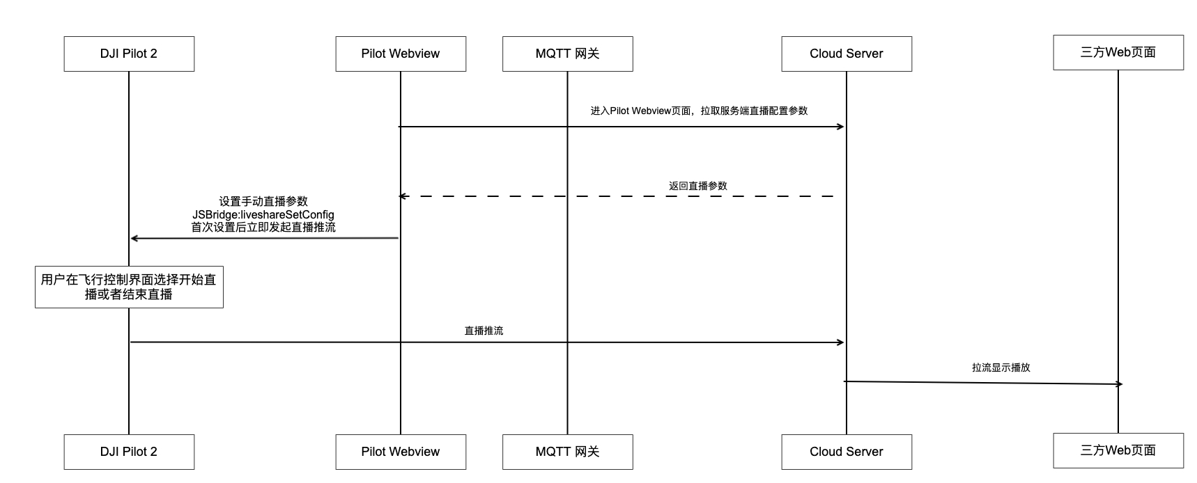 App 端调用 JSBridge 手动直播 对于无需后台直播观看,但是需要在用户使用时,开启直播,把码流传回服务端进行存档分析的场景,可以通过该接口组合,让用户在Pilot 中手动触发直播功能,详细步骤如下: