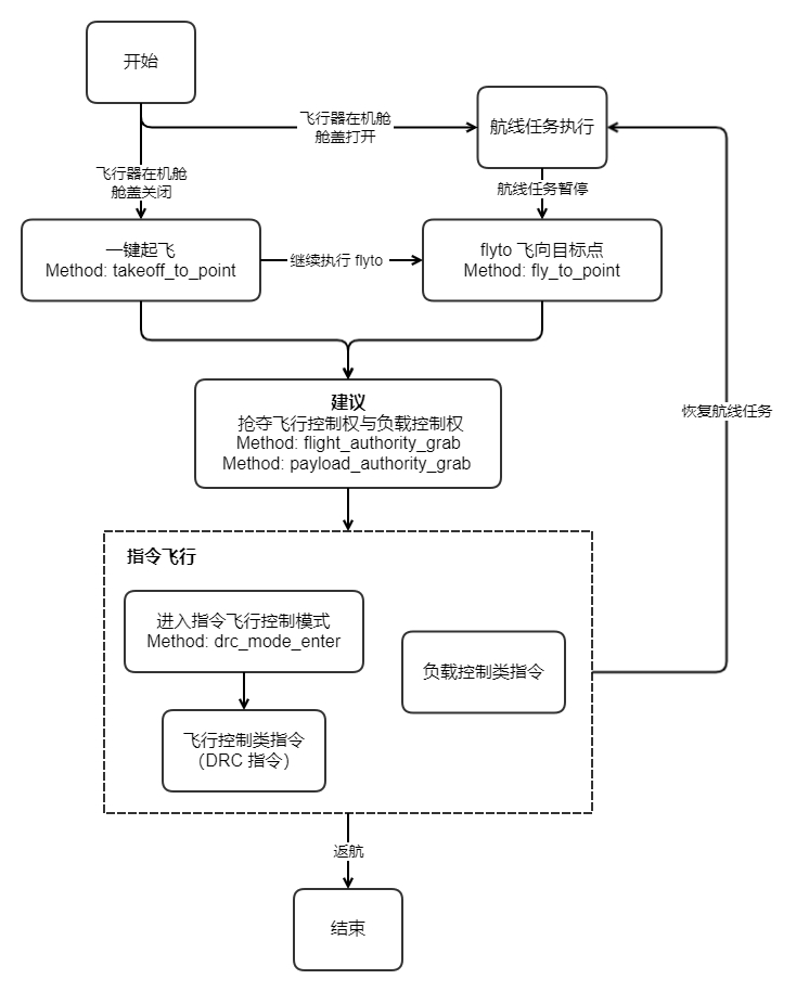 指令飞行功能的开放目的是解决无人机与机场在远程控制过程中,无法即时性操作的限制。在实际应用场景中,飞行器可以从空闲状态响应或暂停正在执行的航线任务。开发者通过手动方式继续控制设备或负载。通过指令飞行功能,开发者可以获得安全可靠的飞行器控制、高实时性的指令下发与直播画面传输、osd 信息上报以及对负载的控制能力。