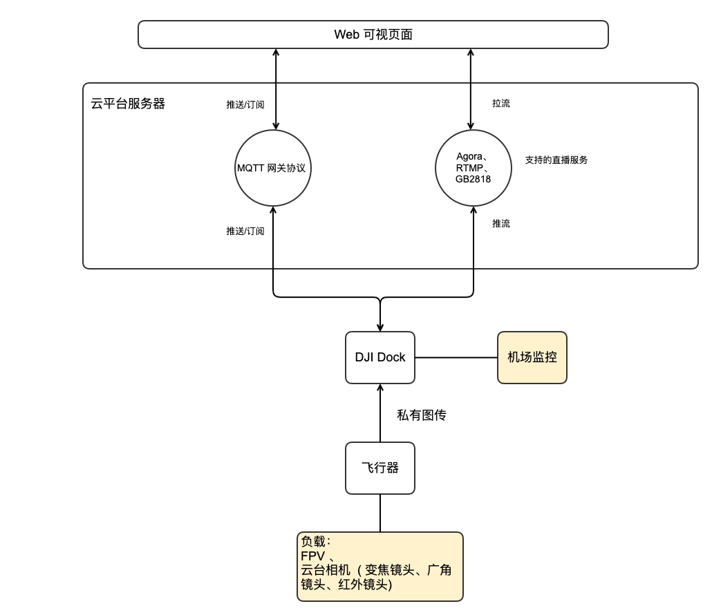 第三方云平台需要预先部署MQTT网关以及流媒体服务器,DJI推流协议支持 Agora/RTMP/GB28181 等模式,其中MQTT网关主要用来做消息通信,配置信息设置和读取。