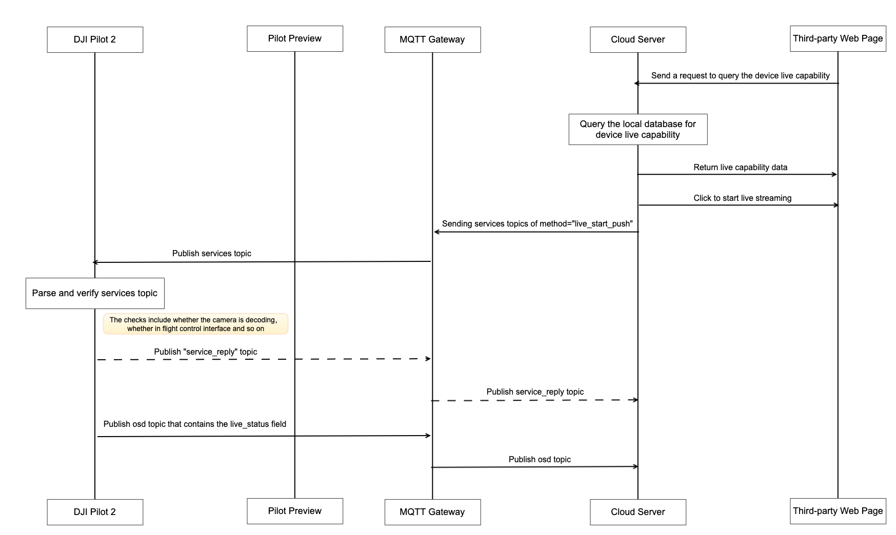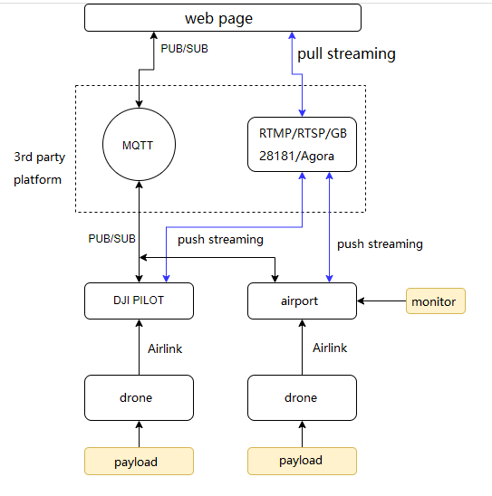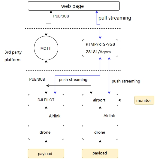 As shown above, the aircraft flight platform is not directly connected to the tripartite cloud platform, it needs to be forwarded through the remote control or the DJI Dock. The communication between the remote control and the DJI Dock and the aircraft is still using DJI private AirLink.