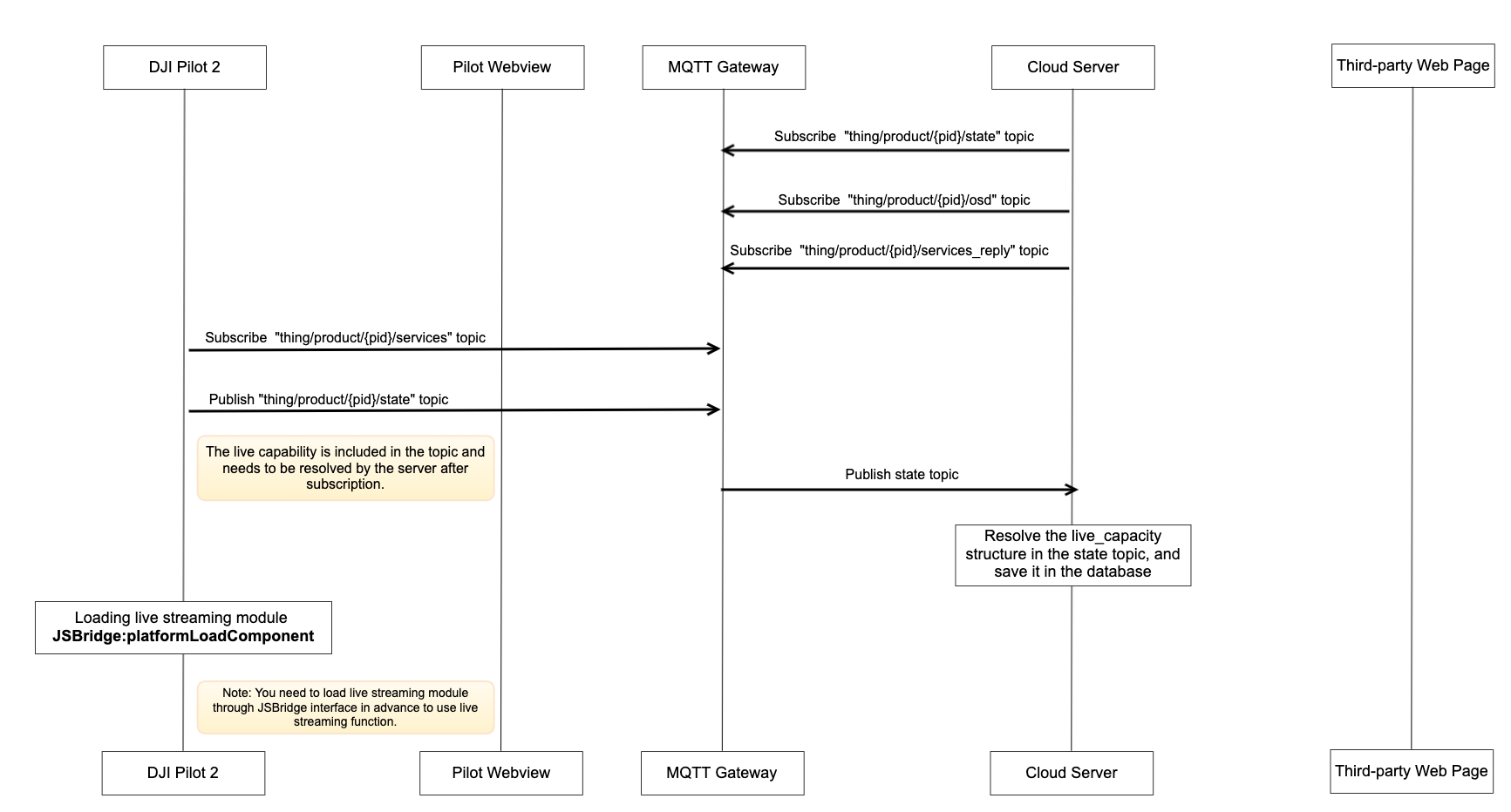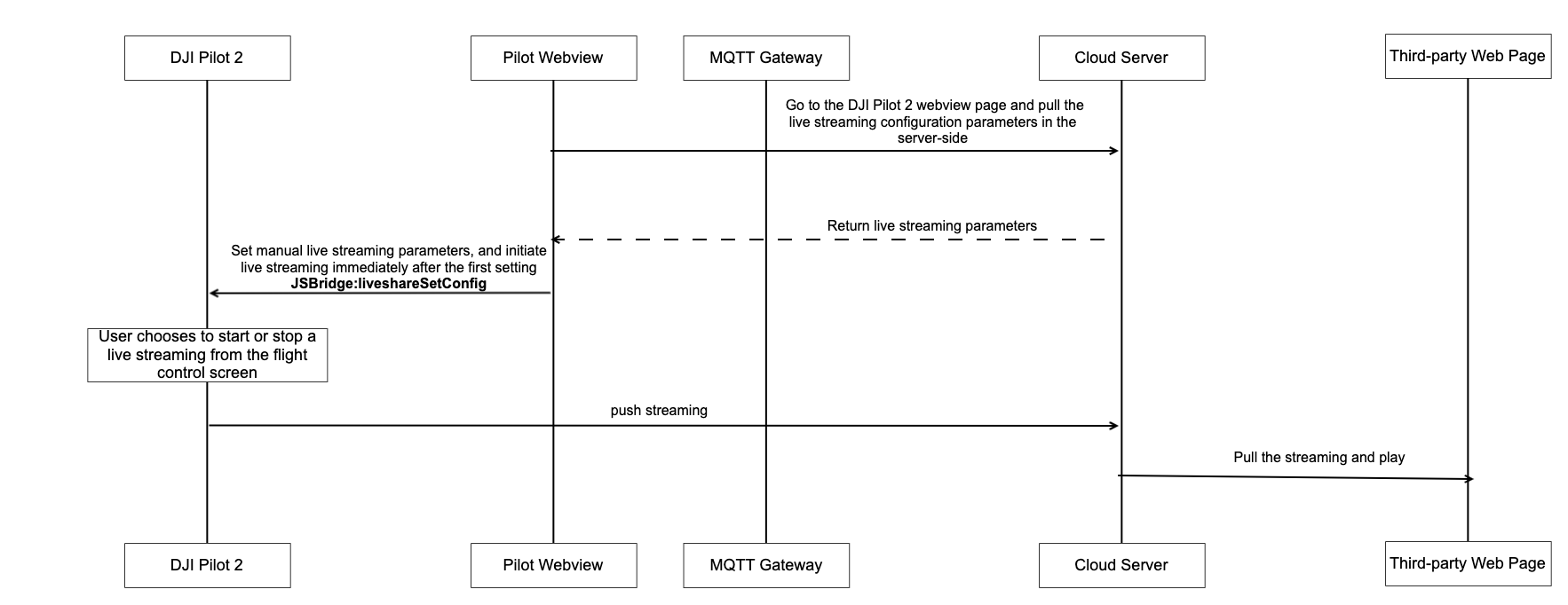window.djiBridge.platformLoadComponent(String name, String param)Before using the live streaming function, you need to pre-load Pilot2's live streaming module via JSBridge in the Webview, developers can consider adding the interface to load the live module directly during the up/down login stage.App Side call JSBridge to start livestreaming For scenarios that do not require live viewing in the background, but need to turn on live streaming when the user is using it and send the code stream back to the server for archival analysis. The interface can be combined to allow users to manually trigger the live streaming function in Pilot2, with the following detailed steps.